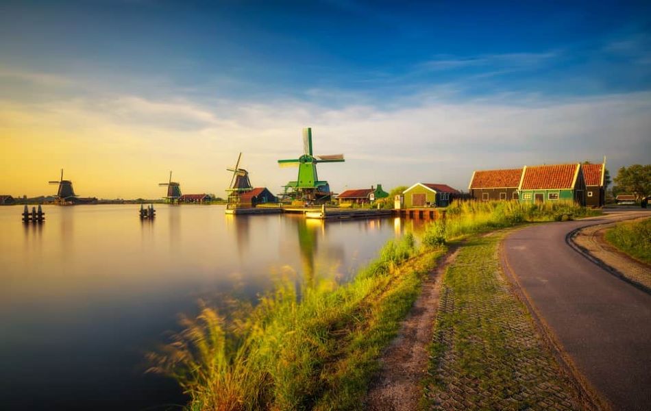- Tham quan Làng Zaanse Schans, xưởng sản xuất guốc gỗ truyền thống, thưởng thức phô mai và bơ tại trang trại. Cánh đồng cỏ xanh ngát cùng với những chiếc cối xay gió biểu tượng của đất nước Hà Lan.